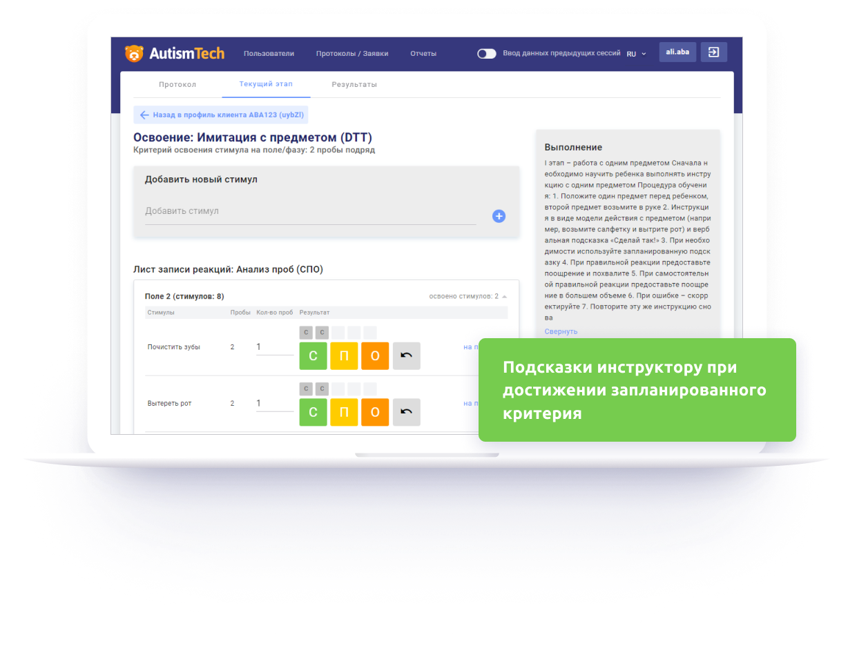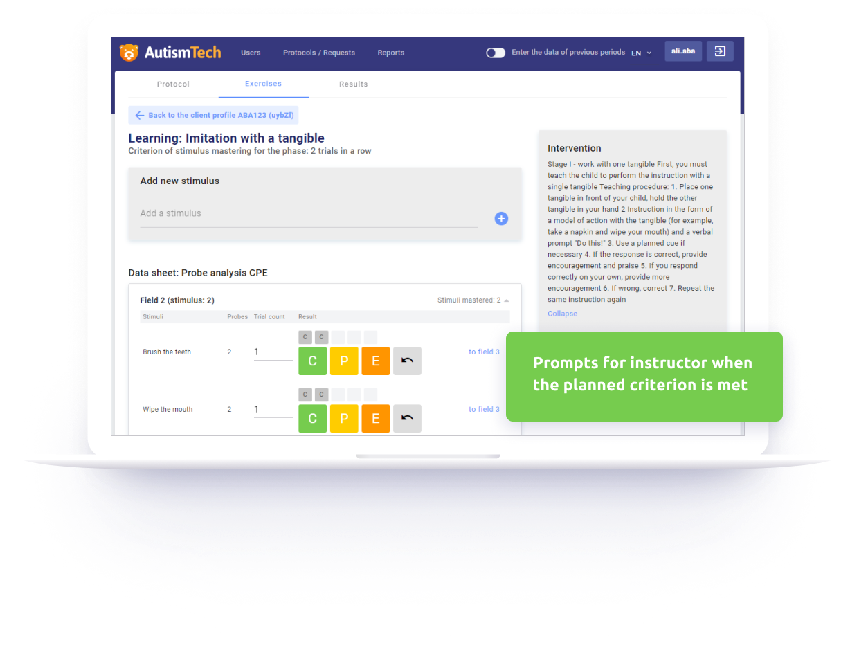 Usage of AutismTech in the ABA-centre, or in the private practice of a bahavior specialist reduces the time and resource consuption to prepare behavior recording sheets and simplifies control of the intervention effectiveness. Also, the system shortens the time of decision-making when correcting the intervention, increases the productivity of a multidisciplinary team. Moreover, the platform lets record relevant data by people with minimally possible level of training in Applied Behavior Analysis, reducing the level of the observer mistakes and making prompts on reaching the target criterion level right on the screen, as if the qualified specialist is beside!
